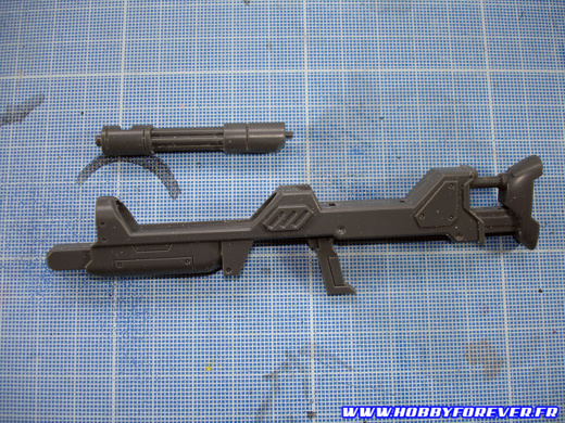 Sur la gatling le canon est normalement maintenu, au niveau de l'encoche que vous pouvez voir sur la photo, par l'arceau du fusil. Il suffit de découper la barre de maintien sous l'arceau pour pouvoir simplement enficher le canon en passant par l'arceau.