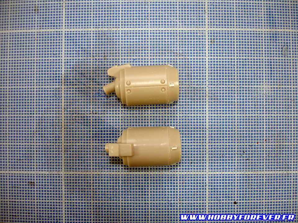 Cette première étape de préparation faite, passons à un peu de détaillage. Pour commencer voici les éléments sur les épaules. Il y a normalement 4 petits détails en relief à leur extrémité, mais 2 d'entre eux sont placés sur la ligne de jointure et disparaissent au ponçage. J'ai tout simplement remplacé ces détails par de fins bouts de carte plastique (CP) de 0,25mm d'épaisseur.