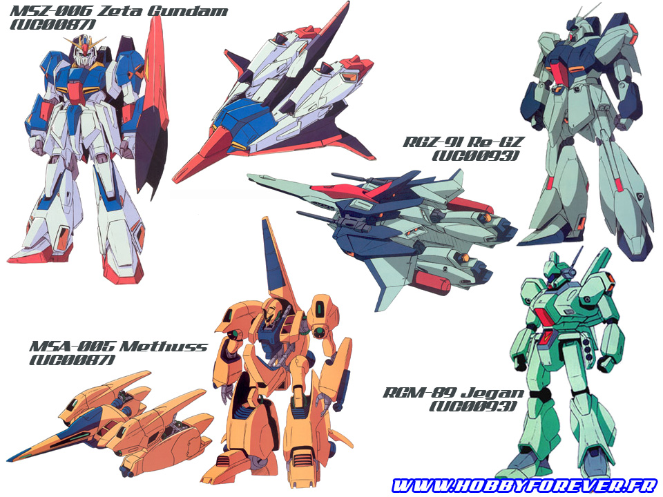 - le RGZ-95C ReZEL Commander Type Defender a-Unit : version commander équipée d'un nouveau backpack avec 6 pods à missiles et de thrusters additionnels pour compenser le poids supplémentaire de cet imposant équipement.
