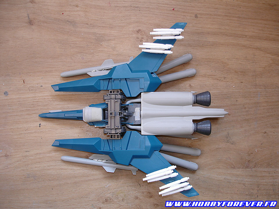 La pièce centrale à l'arrière est issue du bouclier du premier MG Zeta Gundam, avec dessous une structure en carte plastique (CP) qui permet d'accueillir un propeller tank. Les réacteurs sont des option parts (OP) Kotobukiya que j'ai habillé en ajoutant des barres horizontales en CP. J'ai détaillé enfin le tout avec diverses pièces de récup de la boite à rabiot et des OP. Enfin j'ai relié le fuselage à l'avant du backpack avec des chutes de grappe coudées pour figurer des tuyaux.