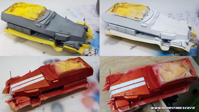 J’ai ensuite masqué le bas de caisse puis appliqué du blanc laquer Starduscolors. J’ai masqué deux bandes sur le capot façon Mustang avant d’appliquer du Solar Red de la gamme laquer Sparkle de Stardustcolors. Cette peinture à effet a un très beau rendu pailleté avec de très beaux reflets orangés au soleil. Elle nécessite d’être vernis en brillant pour avoir son meilleur rendu.