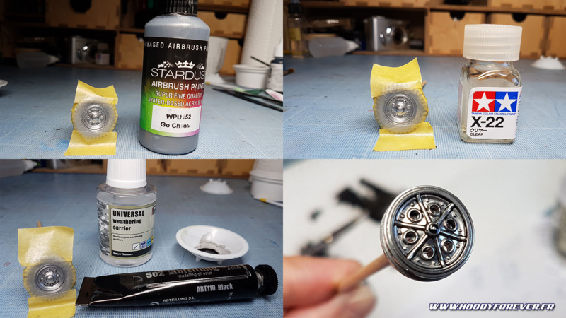 Etape suivante les jantes chromées. Pour cela j’ai utilisé le Go Chrome de Stardustcolors à l’aérographe, que je vous ai déjà présenté dans une vidéo. C’est un chrome miroir très facile à appliquer, sans sous-couche nécessaire. Il suffit de bombarder à l’aéro pour obtenir une grosse couche humide et couvrante. Le chrome « flottant » se forme tout seul. Son défaut c’est qu’on ne peut pas le manipuler, même une fois sec, sans risquer de laisser des traces de doigts. L’utilisation d’un vernis enamel permet d’éviter ce problème en conservant un effet chrome plutôt correct. J’ai donc verni au vernis brillant enamel Tamiya X-22, dilué à proportion 1:1 avec le diluant enamel X-20 de la marque. Il faut obtenir la couche la plus fine possible pour impacter le moins possible l’effet chrome. Une fois le vernis sec la pièce est manipulable sans risque.