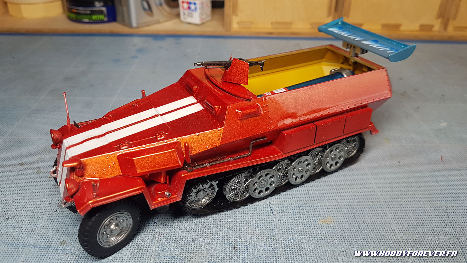 Maiiiiis je trouvais qu’il manquait encore un petit quelque chose à ce Sdkfz 251 Racing… Un spoiler ! Petit scratch en carte plastique, peinture alu puis peinture Starduscolors Sparkle Ice Blue pour un effet alu / bleu métallisé selon l’angle de vision. Laissé en mat pour trancher avec la carrosserie. Enfin j’ai réalisé une inscription « Berlin Drift » à l’aérographe à l’aide d’un pochoir maison, peint en dégradé blanc / bleu.