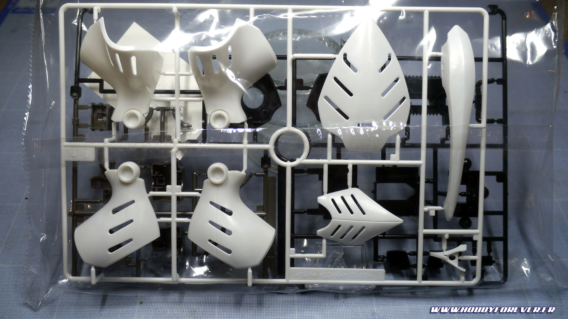 Le Qubeley Damned propose également certaines pièces d'armures retravaillées, notamment la tête, les avant-bras, les pans de jupe avant et arrière, les pieds, ainsi que les cercles des épaules. Enfin, comme la plupart des MG P-Bandai, il nous vient avec une petite planche de décals à l'eau.